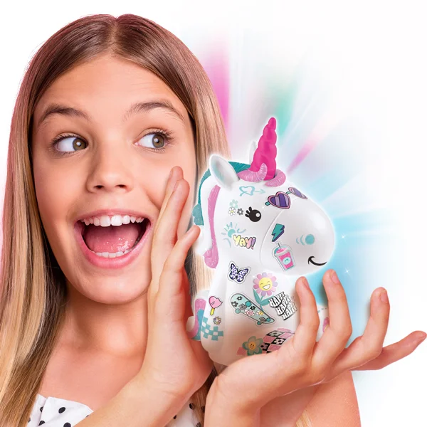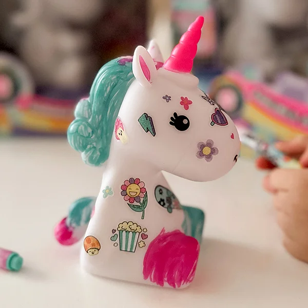 Dzięki dołączonym do zestawu 2 mazakom oraz arkuszowi brokatowych naklejek, można całkowicie spersonalizować swojego jednorożca.